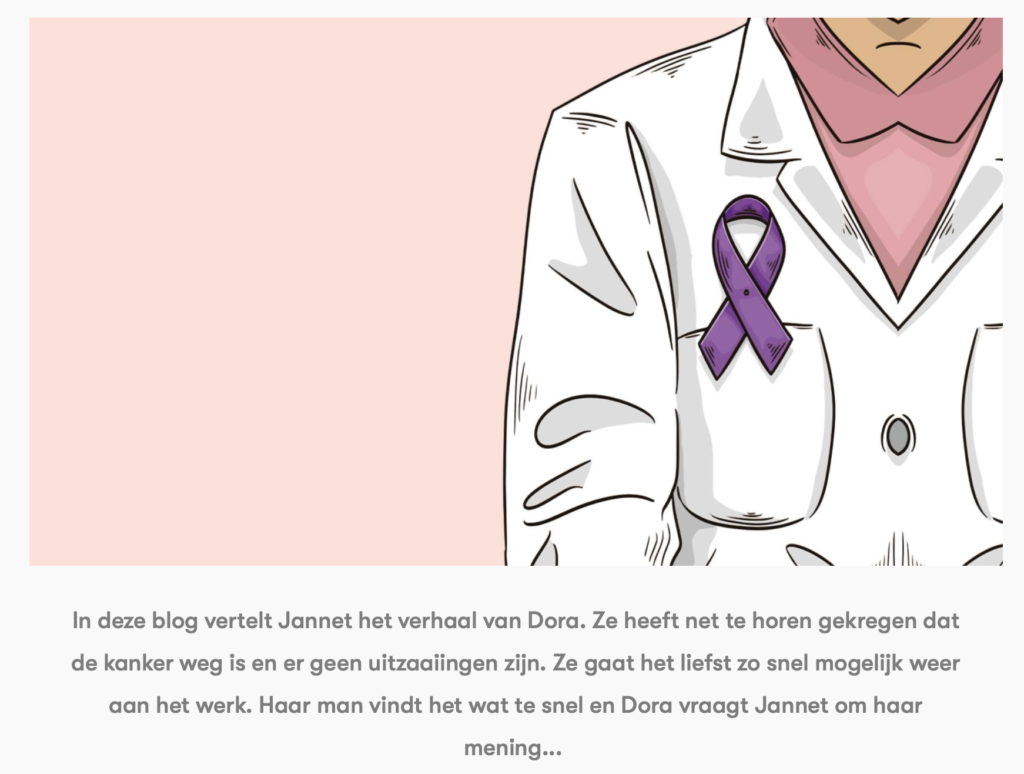 Een dikke krullenbos komt de kamer uit van de chirurg, met een blik in haar ogen alsof ze het meest toffe concert heeft bijgewoond in jaren. De opluchting straalt van haar gezicht. “Het is weg, het is echt weg, en geen uitzaaiingen in mijn oksel” roept ze luid en duidelijk de wachtkamer in. Voor we in mijn kamer zijn, hebben de andere patiënten haar hele verhaal al gehoord en nu dus de uitslag na de operatie meegekregen. Er worden wat dingen naar haar geroepen, maar ze hoort er niets meer van, zo uitgelaten is ze. In haar kielzog loopt een man mee naar binnen die mij onbewust allerlei signalen zendt die ik nog niet kan plaatsen.